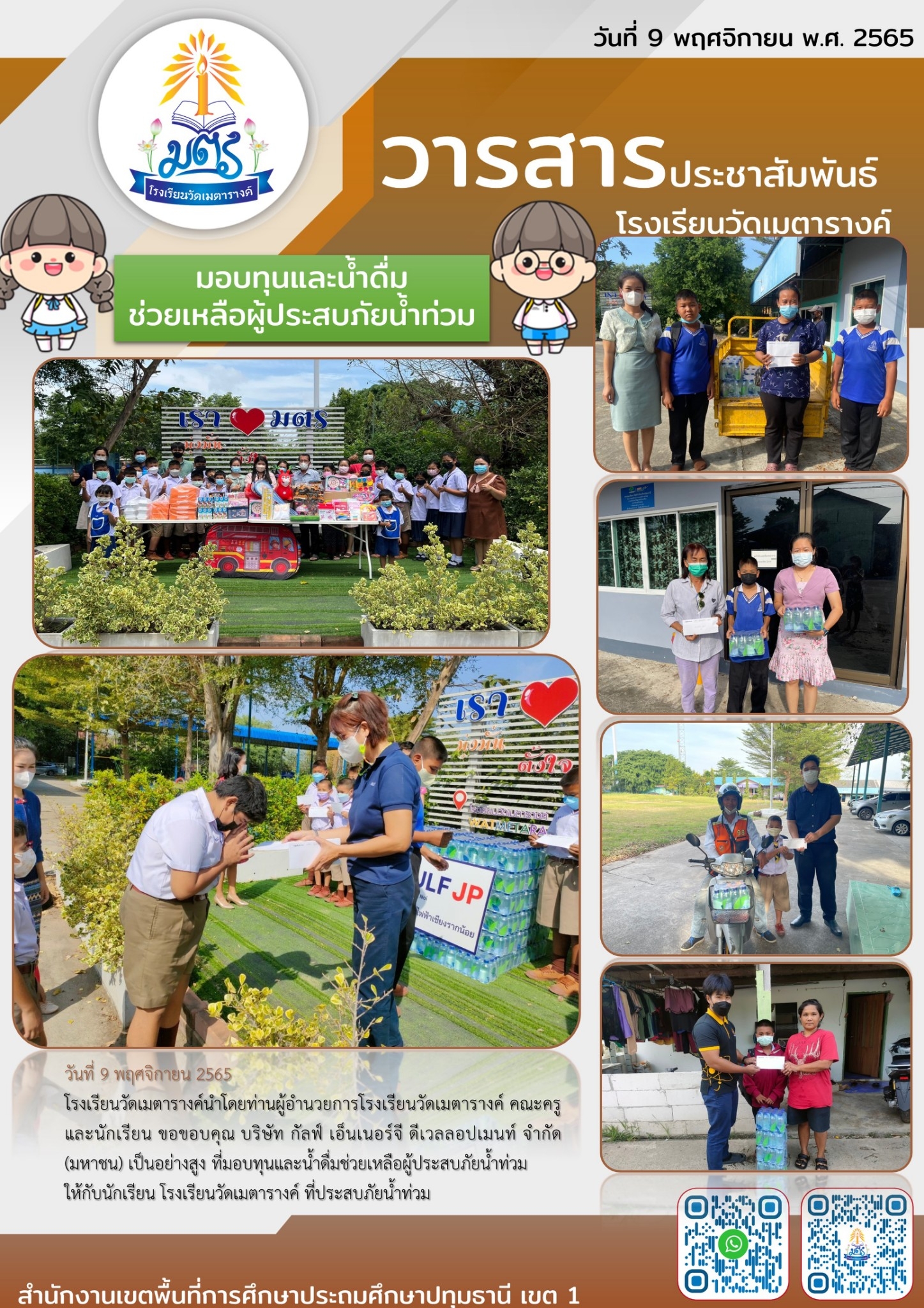 โรงเรียนวัดเมตารางค์นำโดยท่านผู้อำนวยการโรงเรียนวัดเมตารางค์ คณะครู และนักเรียน ขอขอบคุณ บริษัท กัลฟ์ เอ็นเนอร์จี ดีเวลลอปเมนท์ จำกัด (มหาชน) เป็นอย่างสูง ที่มอบทุนและน้ำดื่มช่วยเหลือผู้ประสบภัยน้ำท่วมให้กับนักเรียน โรงเรียนวัดเมตารางค์ ที่ประสบภัยน้ำท่วม