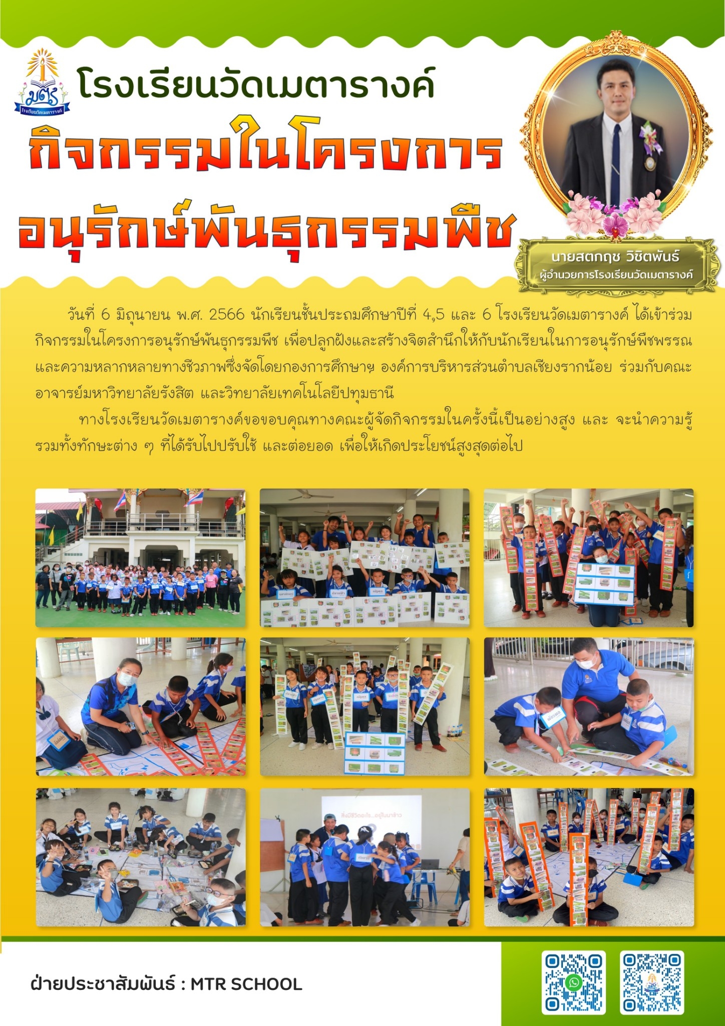 โรงเรียนวัดเมตารางค์กิจกรรมในโครงการอนุรักษ์พันธุกรรมพืช นายสตกฤช วิชิตพันธ์ ผู้อำนวยการโรงเรียนวัดเมตารางค์ วันที่ 6 มิถุนายน พ.ศ. 2566 นักเรียนชั้นประถมศึกษาปีที่ 4,5 และ 6 โรงเรียนวัดเมตารางค์ ได้เข้าร่วมกิจกรรมในโครงการอนุรักษ์พันธุกรรมพืช เพื่อปลูกฝังและสร้างจิตสำนึกให้กับนักเรียนในการอนุรักษ์พืชพรรณและความหลากหลายทางชีวภาพซึ่งจัดโดยกองการศึกษาย องค์การบริหารส่วนตำบลเชียงรากน้อย ร่วมกับคณะอาจารย์มหาวิทยาลัยรังสิต และวิทยาลัยเทคโนโลยีปทุมธานีทางโรงเรียนวัดเมตารางค์ขอขอบคุณทางคณะผู้จัดกิจกรรมในครั้งนี้เป็นอย่างสูง และ จะนำความรู้รวมทั้งทักษะต่าง ๆ ที่ได้รับไปปรับใช้ และต่อยอด เพื่อให้เกิดประโยชน์สูงสุดต่อไปสิ่งมีชีวิต