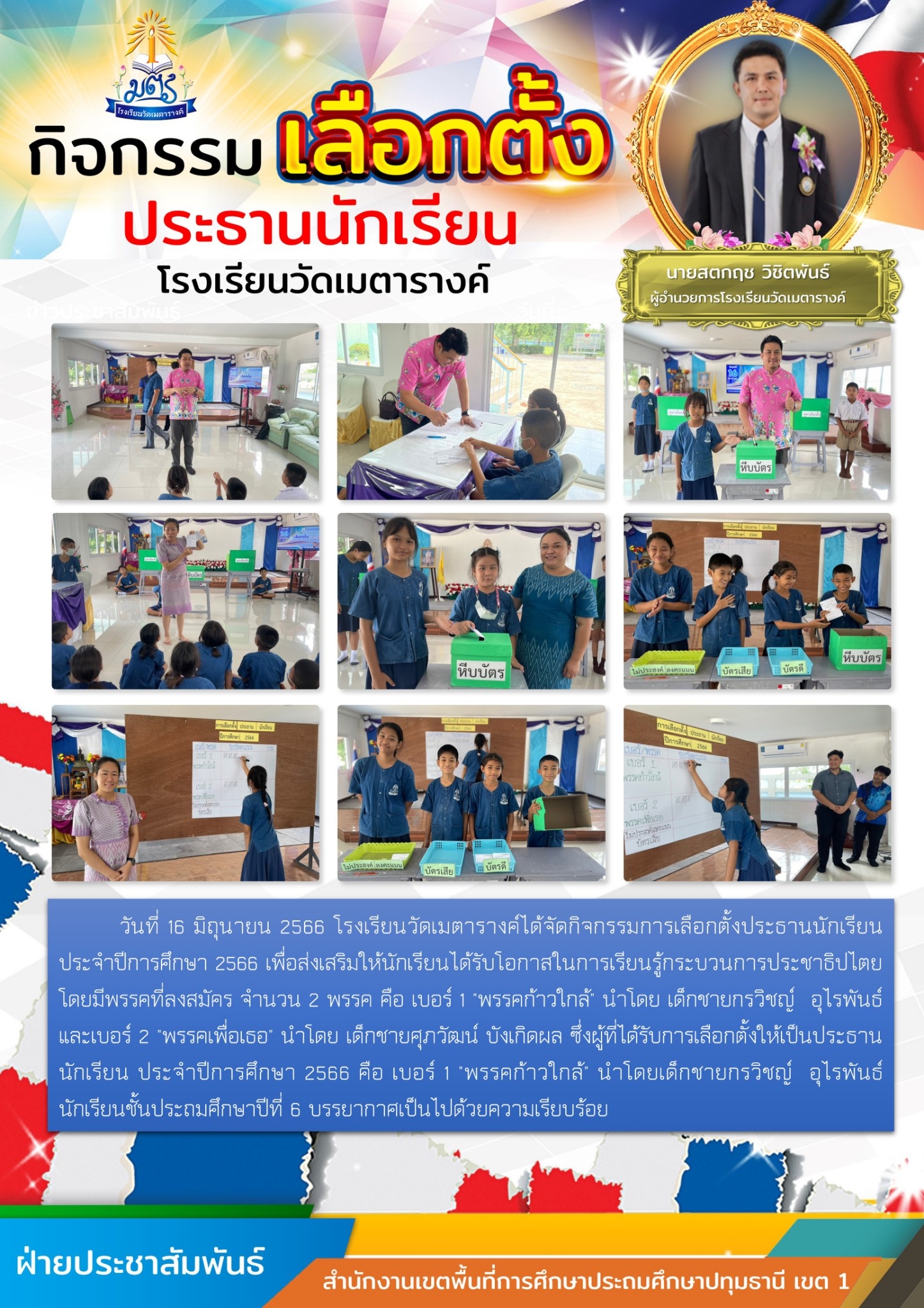 วันที่ 16 มิถุนายน 2566 โรงเรียนวัดเมตารางค์ได้จัดกิจกรรมการเลือกตั้งประธานนักเรียนประจำปีการศึกษา 2566 เพื่อส่งเสริมให้นักเรียนได้รับโอกาสในการเรียนรู้กระบวนการประชาธิปไตยโดยมีพรรคที่ลงสมัคร จำนวน 2 พรรค คือ เบอร์ 1 "พรรคก้าวใกล้" นำโดย เด็กชายกรวิชญ์ อุไรพันธ์ และเบอร์ 2 "พรรคเพื่อเธอ"นำโดย เด็กชายศุภวัฒน์ บังเกิดผล ซึ่งผู้ที่ได้รับการเลือกตั้งให้เป็นประธานนักเรียน ประจำปีการศึกษา 2566 คือ เบอร์ 1 "พรรคก้าวใกล้ นำโดยเด็กชายกรวิชญ์ อุไรพันธ์นักเรียนชั้นประถมศึกษาปีที่ 6 บรรยากาศเป็นไปด้วยความเรียบร้อย