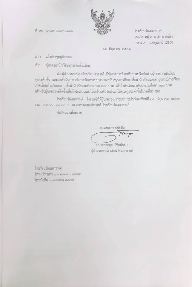 เรียนผู้ปกครองนักเรียนทุกระดับชั้น ขอแจ้งให้ผู้ปกครองมาร่วมประชุมในวันอาทิตย์ที่ 28 มิถุนายน 2563