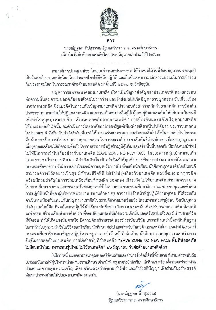 สาร นายณัฏพล ทีปสุวรรณ รัฐมนตรีว่าการกระทรวงศึกษาธิการ เนื่องในวันต่อต้านยาเสพติดโลก (26 มิถุนายน) ประจำปี 2563